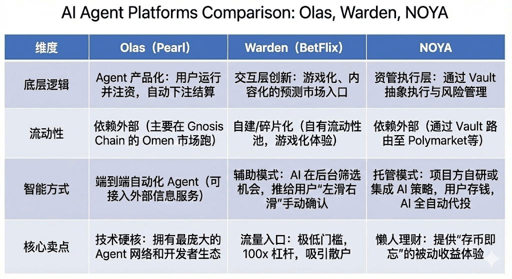 3) NOYA.ai: koncentrując się na "zarządzaniu funduszami + strategiach wykonywanych" poprzez vaulty, przekształca rynek prognoz i wykonanie DeFi w produkty zarządzania aktywami, oferując niskie operacje i niski umysłowy ciężar uczestnictwa. Jeśli później dodane zostaną moduły inteligencji rynku prognoz i wykonania agenta, mogą utworzyć zintegrowany przepływ pracy "badania - wykonania - monitorowania".