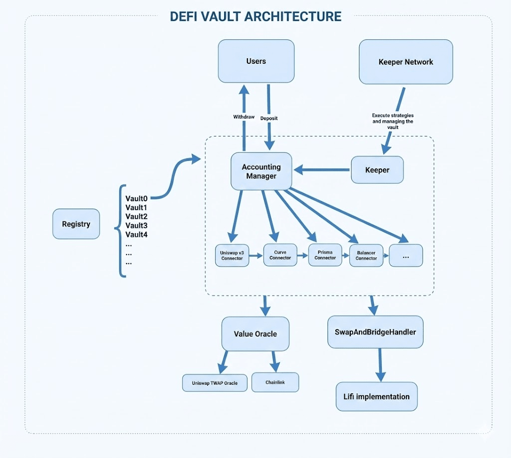 Techniczna architektura NOYA Vault (skarbca): wszystkie skarbców są rejestrowane i zarządzane za pomocą Registry, AccountingManager odpowiada za udziały użytkowników (ERC-20) oraz wycenę netto; warstwa bazowa łączy modułowe Connectors z protokołami Aave, Uniswap itp. i oblicza TVL między protokołami, polegając na Value Oracle (Chainlink + Uniswap v3 TWAP) do realizacji routingu cenowego i wyceny; transakcje i działania międzyłańcuchowe są wykonywane przez Swap Handler (LiFi); ostatecznie, realizację strategii wyzwala Keeper multisig, tworząc zintegrowaną, audytowalną pętlę wykonania.