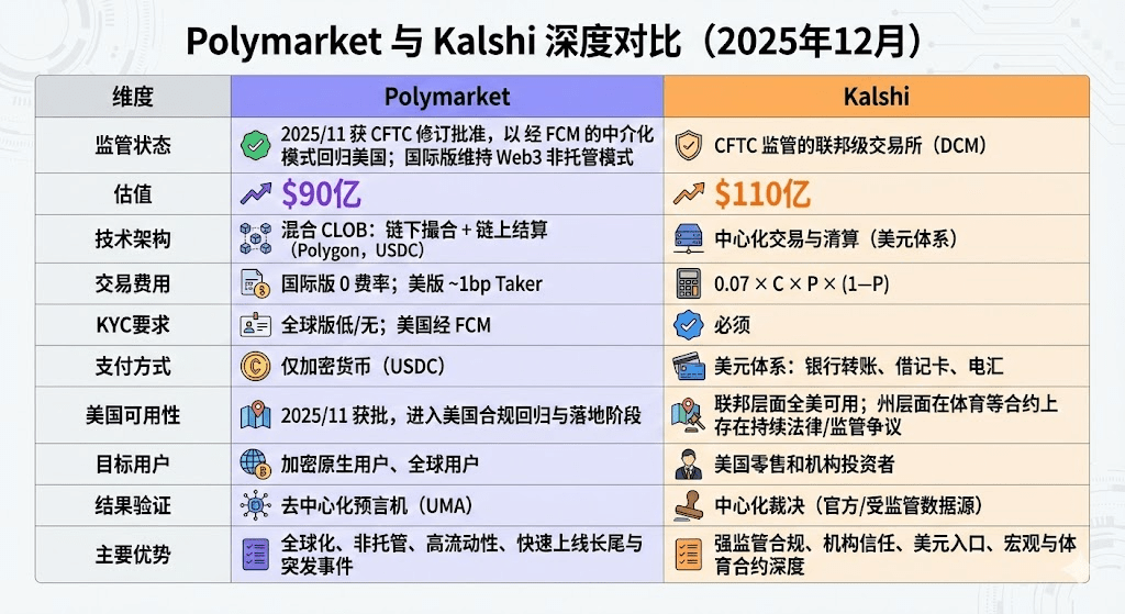 Na koniec 2025 roku rynek prognoz w zasadzie przyjął struktury podwójnego oligopolu dominowane przez Polymarket i Kalshi. Według danych (Forbes), całkowity wolumen transakcji w 2025 roku wyniesie około 44 miliardów dolarów, z czego Polymarket wniesie około 21,5 miliarda dolarów, a Kalshi około 17,1 miliarda dolarów. Kalshi, dzięki wcześniejszym zwycięstwom prawnym w sprawie umów wyborczych, wczesnej przewadze regulacyjnej na amerykańskim rynku prognoz sportowych oraz stosunkowo jasnym oczekiwaniom regulacyjnym, zdołała szybko się rozwinąć. Obecnie ścieżki rozwoju obu tych firm wykazują wyraźne różnice: