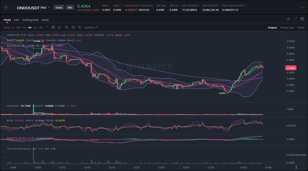 ONDO przeszedł przez zmienny rok 2025, a token odzwierciedla szerszą dynamikę sektora RWA w kontekście makroekonomicznych zmian i rotacji rynku kryptowalut. Dostarczony wykres 4-godzinny pokazuje wyraźny zstępujący kanał od połowy 2025 roku, charakteryzujący się niższymi szczytami i dołami, kulminując w wielotygodniowym zakresie wokół ostatnich lokalnych dołków. Wskaźniki wolumenu handlowego pokazują skurcz podczas zstępowania, sugerując akumulację zamiast agresywnej dystrybucji, podczas gdy oscylator RSI krąży w neutralnym terytorium w pobliżu 40, sugerując potencjalną rewersję średniej, jeśli wsparcie się utrzyma. Całkowita kapitalizacja rynkowa tokenów RWA wzrosła, ale względna siła ONDO lekko ustępuje, pozycjonując go do potencjału dogonienia w ryzykownym środowisku.