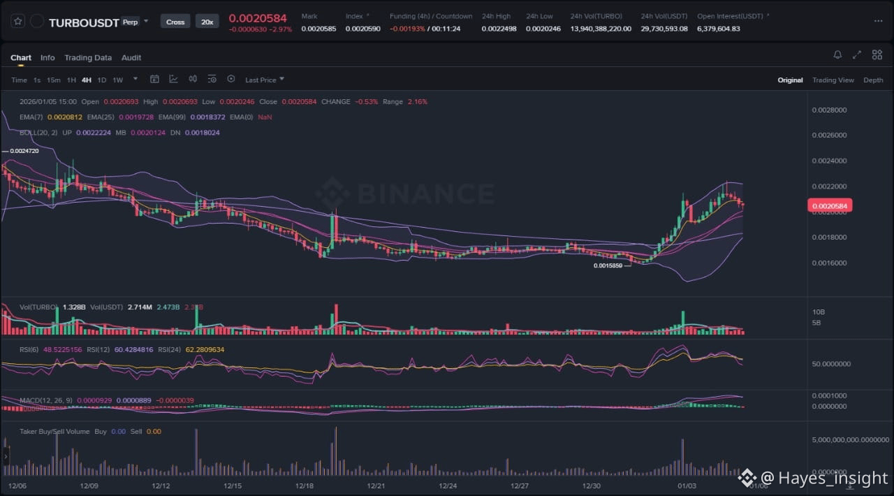 Delving deeper, TURBO's price structure has evolved from a prolonged range-bound consolidation phase into a breakout attempt, characterized by an impulsive five-wave advance on the 4-hour timeframe. The chart displays volatility expansion, with the ATR (Average True Range) doubling from prior sessions, signaling increased market participation. Notable is the liquidity sweep below the recent swing low around early November, which trapped shorts before reversing into this rally— a classic pattern for trapping liquidity pockets ahead of mean reversion higher. The RSI (Relative Strength Index) has surged from oversold territory into overbought without divergence, supporting sustained upside potential. However, shadows on the latest candles hint at potential exhaustion if volume fails to follow through, though the primary trend channel remains intact, sloping positively.