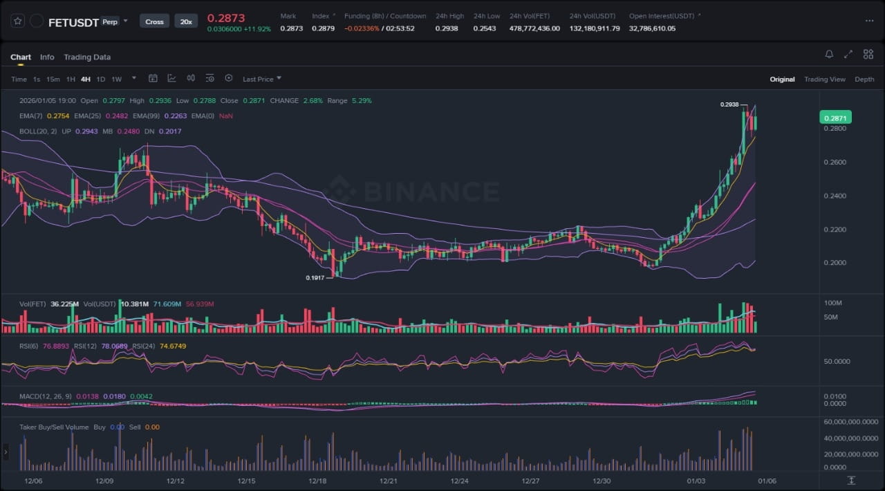 Para FET/USDT na Binance pokazuje zdecydowane wybicie z wielomiesięcznego zstępującego kanału, a akcja cenowa przechodzi z długotrwałej kompresji do rozszerzenia zmienności. Obecnie handluje w pobliżu 0,26 USD, jak podano w ostatnich raportach, FET ustabilizował się po impulsywnym rajdzie, który przebił wcześniejsze poziomy oporu. Obserwowalne elementy to wyraźne odrzucenie dolnej linii wsparcia trendu wokół minimów z połowy grudnia, po którym nastąpił szereg wyższych dołków formujących się od końca listopada, a także przyspieszenie odkrywania ceny powyżej 50-okresowej średniej ruchomej. Profil wolumenu ujawnia kieszenie absorpcji płynności podczas wzrostu, co sugeruje zainteresowanie instytucjonalne, podczas gdy niższy interwał pokazuje początkową konsolidację po wybiciu, testując strefę wybicia pod kątem ryzyk powrotu do średniej. Ogólna struktura wskazuje na byczą tendencję, napędzaną udanym ponownym testem złamanego oporu, który teraz działa jako wsparcie, co może ułatwić dalszą fazę dystrybucji, jeśli momentum się utrzyma.