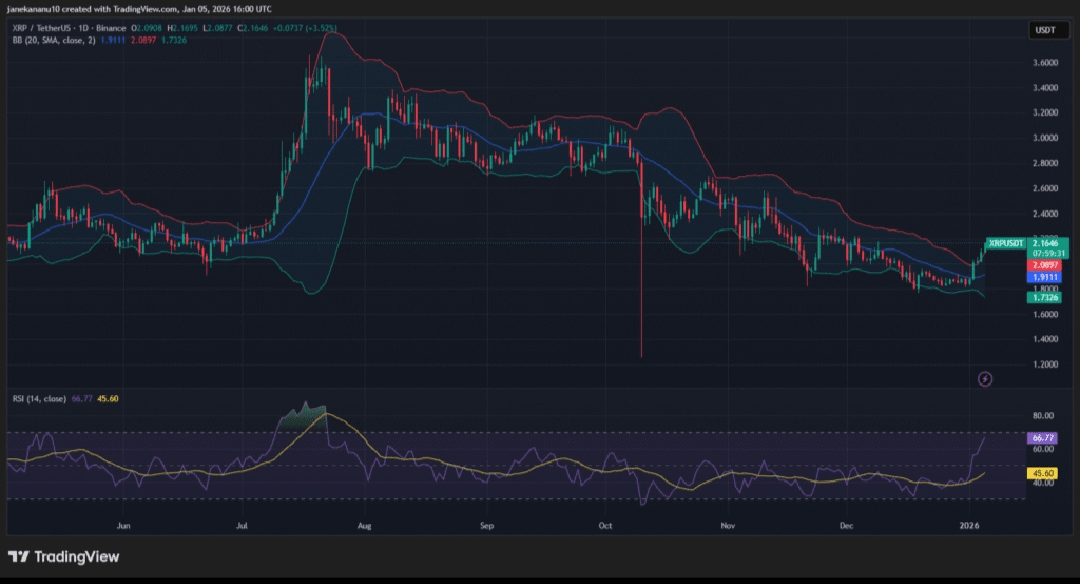 XRP has experienced a significant price surge, reaching $2.1646. The price movement has attracted attention as it breaks out above the upper Bollinger Band, which typically indicates increased volatility and a potential for further price action.