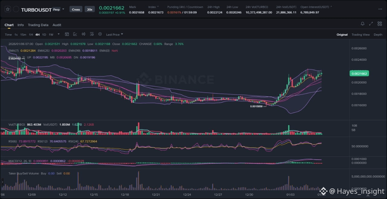 While the setup boasts high-probability elements, overbought RSI and widened Bollinger Bands signal elevated volatility risk, where sudden reversals could exploit thin liquidity pockets; always factor in broader market beta, as TURBO's meme coin nature amplifies correlation to BTC dominance shifts.