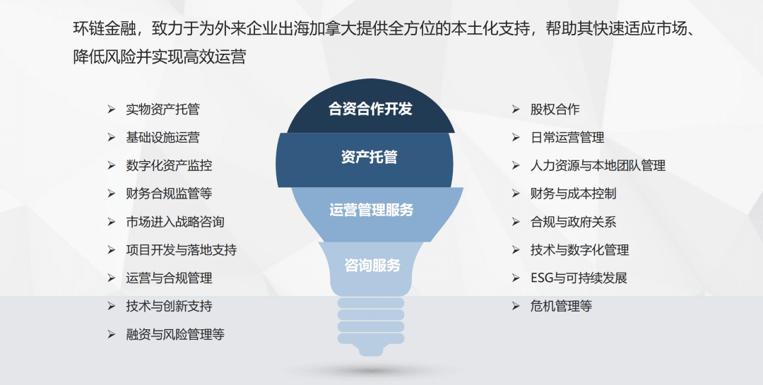 Działa jako most do współpracy biznesowej między Kanadą a Chinami, oferując kompleksowe usługi profesjonalne w zakresie wymiany handlowej, inwestycji transgranicznych i innych.