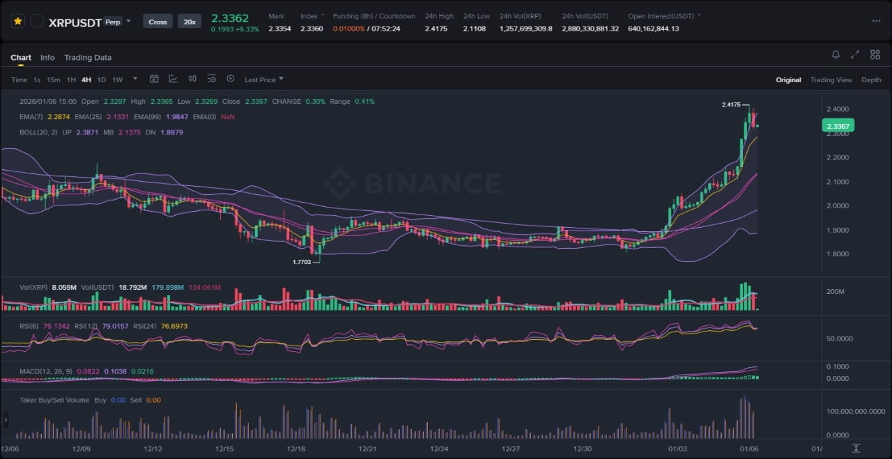XRP wkracza w 2026 rok z eksplozyjnym impetem, osiągając wzrost o ponad 12% w jednej sesji, aby przełamać kluczowy opór na poziomie $2.35, napędzany rosnącymi napływami ETF i potwierdzonym byczym układem, który plasuje go jako najlepszego wykonawcę wśród głównych kryptowalut od początku roku. Ten rajd, likwidujący krótkie pozycje o wartości 25 milionów dolarów, podkreśla potencjalną zmianę z konsolidacji w impulsywny trend wzrostowy, ale traderzy muszą poruszać się w zmienności, gdy cena konsoliduje się w pobliżu $2.38.