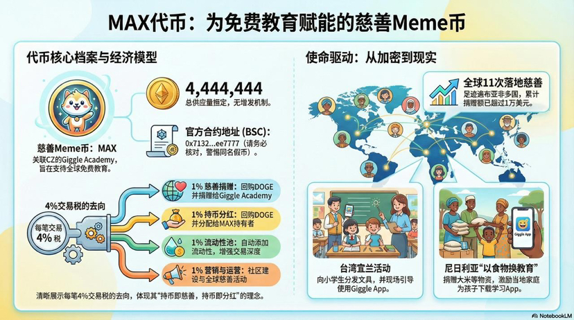 Pozycjonowanie dotyczy Giggle Academy jako "globalnej warstwy wykonawczej" i "sieci promocyjnej społeczności", nie jesteśmy zwykłą monetą meme, ale realizatorem wizji CZ. Długoterminowa wartość polega na ciągłym budowaniu ekosystemu darmowej edukacji: od aplikacji online po lekcje offline, od Tajwanu do całego świata, nasze opłaty transakcyjne automatycznie trafiają do Giggle, pomagając więcej dzieciom otworzyć drzwi do wiedzy. Pomyślcie, Giggle Academy dotarło już do 90 000 dzieci, #Max odgrywa w tym rolę mostu, to nie jest krótkoterminowa spekulacja, ale długofalowy wpływ — przekształca naukę w grę, a dobroczynność w nawyk.
