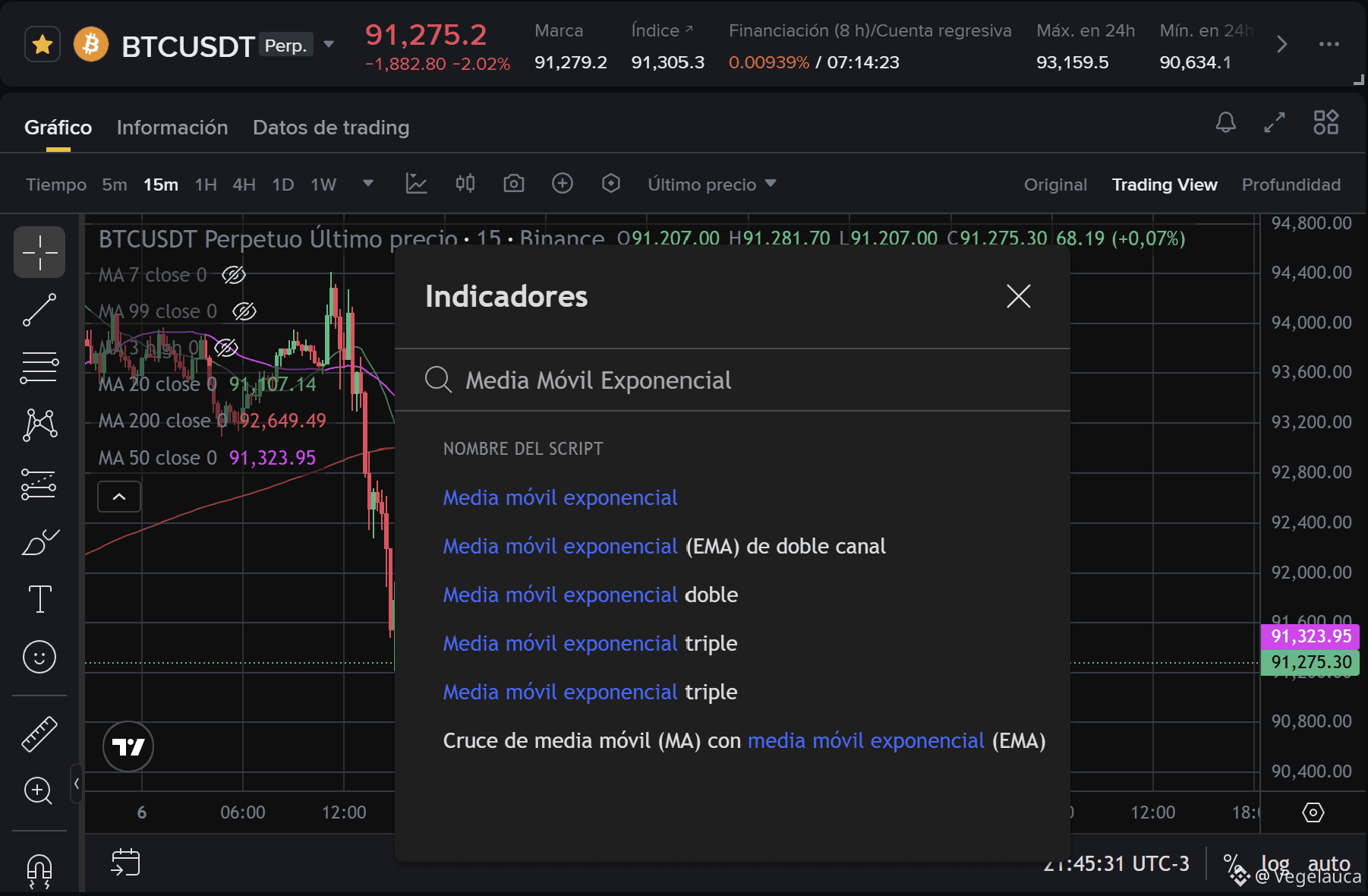 2.Busca el indicador "EMA" o "Media Móvil Exponencial". Agrégalo dos veces.
