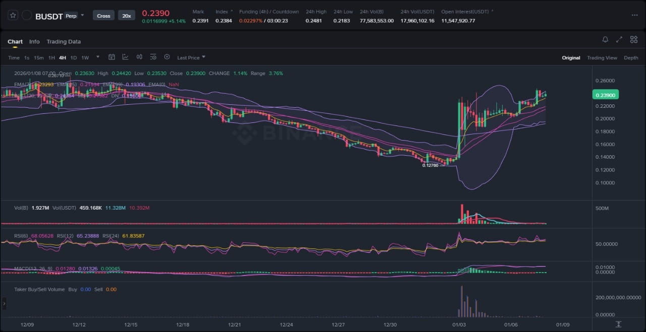 Analiza dołączonego wykresu dla BUILDon (B) ujawnia wyraźną strukturę wzrostową, charakteryzującą się wyższymi szczytami i wyższymi dołkami w ciągu ostatnich kilku tygodni, z trwającą próbą wybicia z wielotygodniowej fazy konsolidacji. EMA 7-okresowa znajduje się powyżej EMA 25-okresowej, która z kolei pozostaje znacznie powyżej EMA 99-okresowej, potwierdzając bycze dostosowanie w krótkoterminowych, średnioterminowych i długoterminowych trendach — brak oznak odwrócenia trendu w zakresie lub spadku. Wstęgi Bollingera pokazują ekspansję zmienności w górę, z ceną przylegającą do górnej wstęgi, co wskazuje na utrzymującą się presję kupna, a nie nadmierne przedłużenie. Obserwowalne elementy obejmują impulsywny ruch od niedawnego swing low w okolicach $0.50, po którym nastąpiła krótka konsolidacja, tworząc wzór flagi byczej, oraz odrzucenie na lokalnym swing high w pobliżu $0.75, które szybko przekształciło się w nowe wzrosty. Na obecnym poziomie $0.71, który pokrywa się z kluczową strefą wsparcia z wcześniejszych kieszeni płynności, setup wydaje się gotowy na kontynuację.