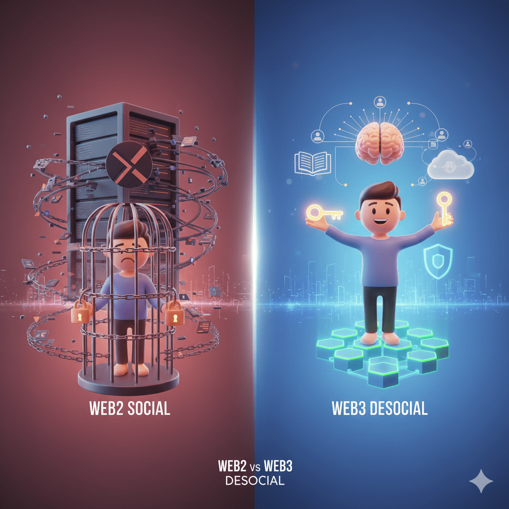 Czy kiedykolwiek czułeś, że Twoje konto nagle zostało zablokowane lub Twoje dane osobowe zostały sprzedane? W erze Web2 jesteśmy produktem. Jednak w erze Web3 DeSocial przychodzi, aby przywrócić Ci suwerenność.