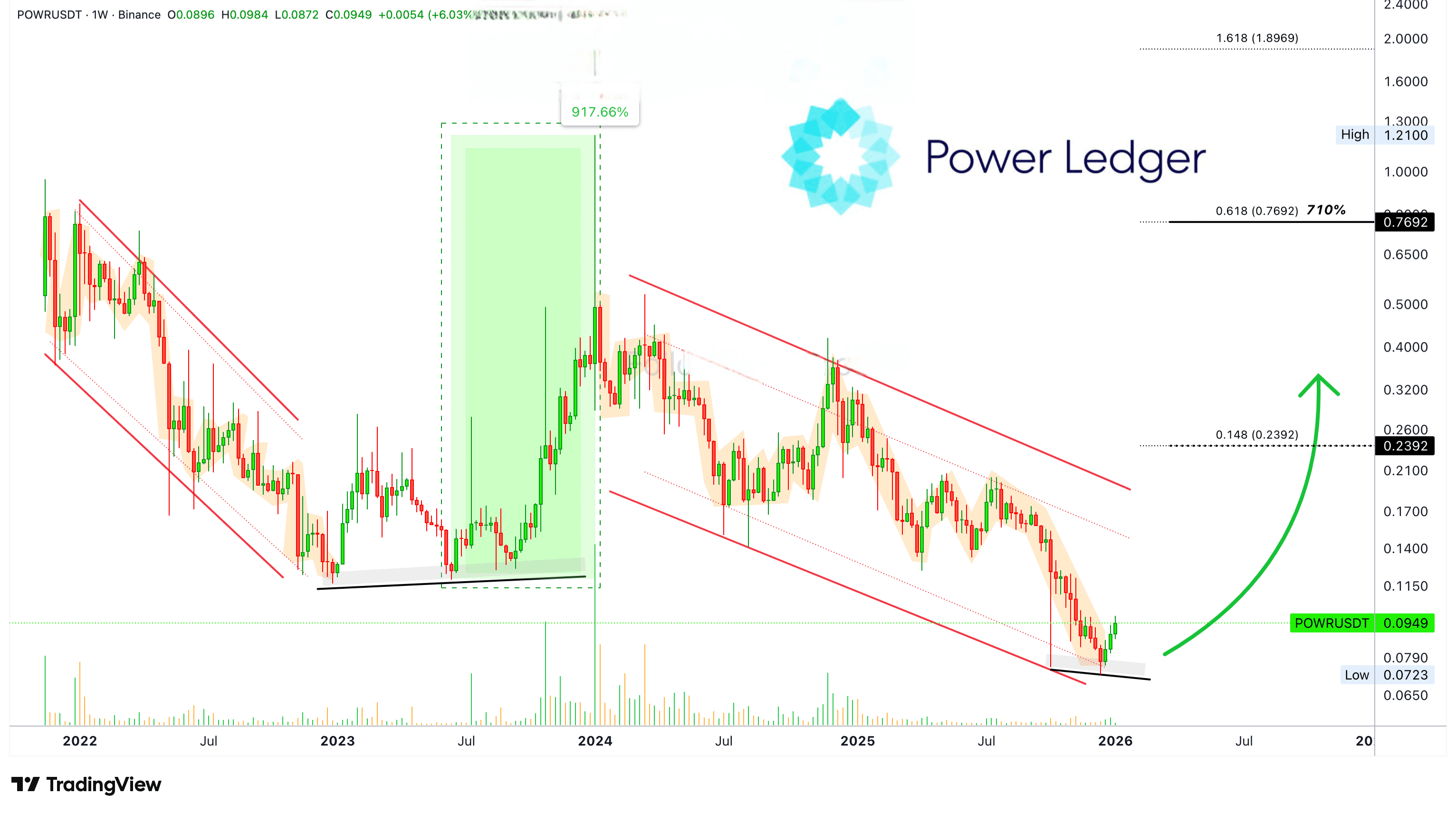 Power Ledger został utracony w cyklu wzrostowym od 2023 roku. Zwróć uwagę, że projekt całkowicie zignorował Bitcoin w 2025 roku, podobnie jak wszystkie inne projekty, które rosły. Podczas gdy część rynku była wznosząca, inna część pozostawała spadkowa. Zmiany są na końcu.