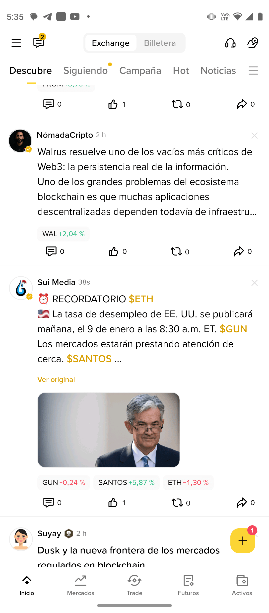 W feedzie pojawiają się wpisy różnych profili. Na przykład, wpis twórcy mówiącego o konkretnym projekcie, takim jak Walrus, w towarzystwie małego wskaźnika zmiany procentowej tokena WAL. Ten szczegół jest ważny: Binance Square łączy treść z rzeczywistymi aktywami. To nie jest tylko czytanie. To kontekst finansowy. Kiedy widzisz post z tokenem i procentem, Binance mówi ci „to się teraz rusza”. Niżej widzisz wpis z medium, takim jak Sui Media, gdzie mówi się o wydarzeniu makroekonomicznym, stopie bezrobocia w Stanach Zjednoczonych, obok kilku aktywów oznaczonych jako ETH, GUN lub SANTOS, z każdą ze swoimi zmianami. To uczy czegoś fundamentalnego: rynek kryptowalutowy nie żyje w izolacji. Tradycyjne wiadomości ekonomiczne mają bezpośredni wpływ na ceny kryptowalut.