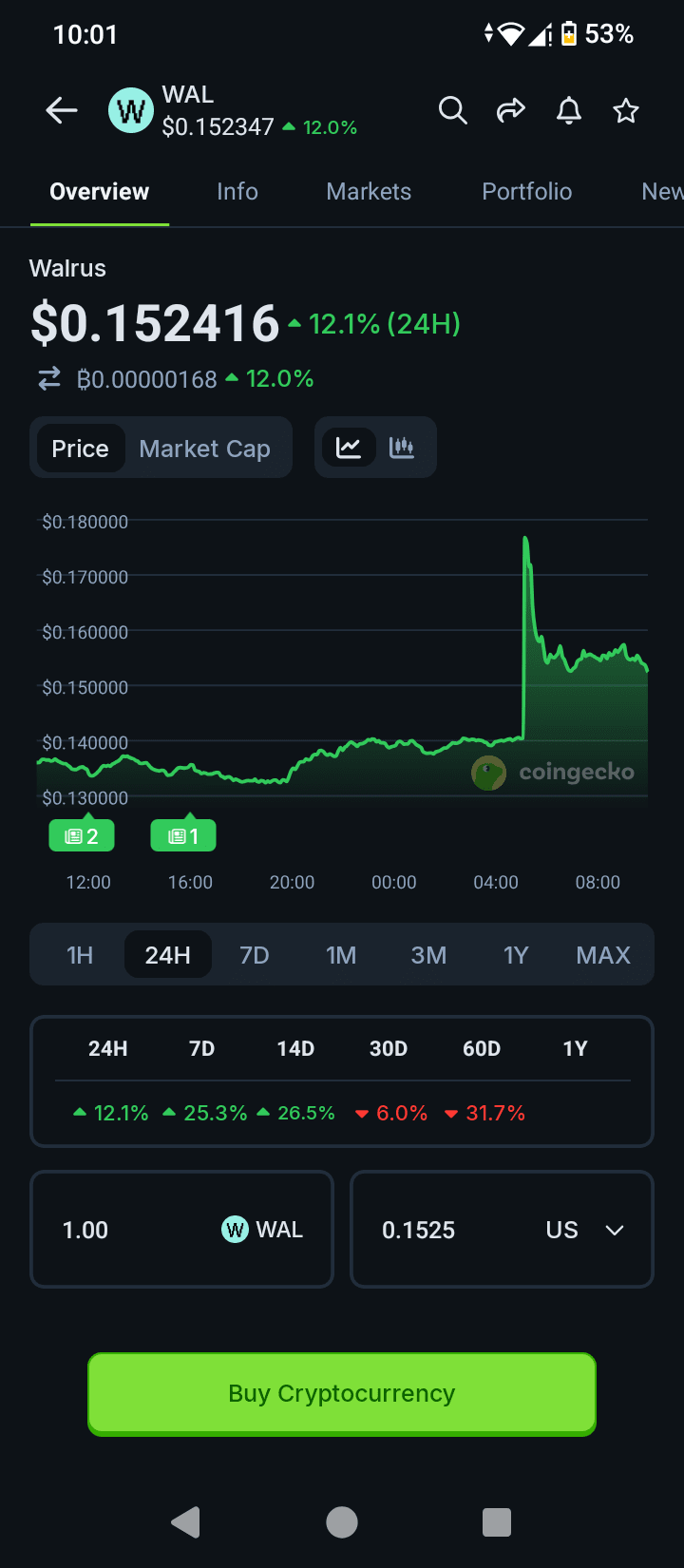 W ciągu ostatnich 24 godzin WAL zanotował objętość obrotów na poziomie 58,6 miliona USD, co świadczy o silnym zaangażowaniu rynku. Z kapitalizacją rynkową na poziomie 241 milionów USD, Walrus znajduje się wśród projektów średniej kapitalizacji, które często inicjują kolejny wzrost. Obiegowa podaż wynosząca 1,48 miliarda tokenów zapewnia dostępność, jednocześnie pozostawiając miejsce na przyszły wzrost.