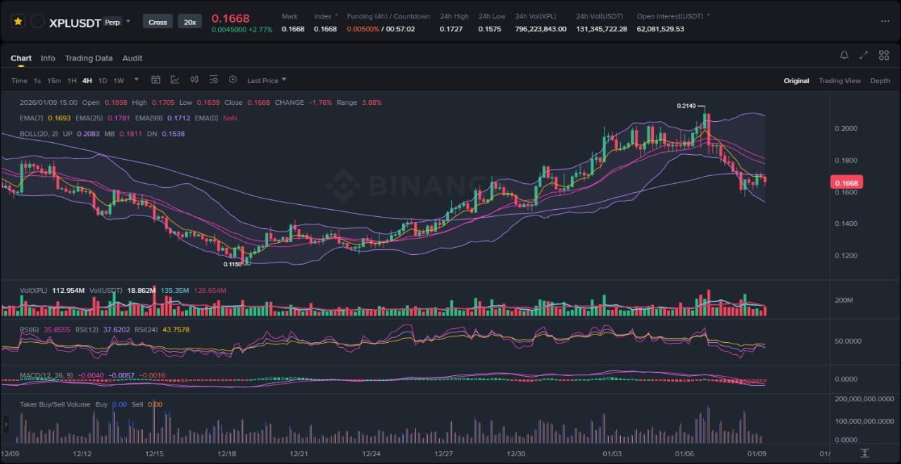 Analizując dołączony 4-godzinny wykres dla XPL/USDT na Binance, struktura cenowa ujawnia trwający trend wzrostowy próbujący wydostać się z zakresu konsolidacji trwającego kilka tygodni. Token rośnie od połowy grudnia 2025 roku, tworząc wyższe dołki wokół 0,1400, które teraz służy jako wsparcie strukturalne. Obecnie handlując na poziomie 0,2029, XPL znajduje się tuż poniżej górnej granicy zakresu blisko 0,2100, z impulsywnym ruchem widocznym w ostatnim wzroście o 15%, który przebił górną wstęgę Bollingera. Wykładnicze Średnie Ruchome (EMA) potwierdzają byczą zgodność: 7-okresowa EMA (zielona) nachyla się w górę i przecina powyżej 25-okresowej EMA (żółta), podczas gdy obie pozostają dobrze powyżej 99-okresowej EMA (czerwona), co wskazuje na utrzymującą się dynamikę w trendzie wzrostowym, a nie w zakresie bocznym. Wstęgi Bollingera rozszerzyły się, sygnalizując rozszerzenie zmienności po fazie kompresji, przy czym cena przytula górną wstęgę, co często poprzedza kontynuację w rynkach o trendzie.