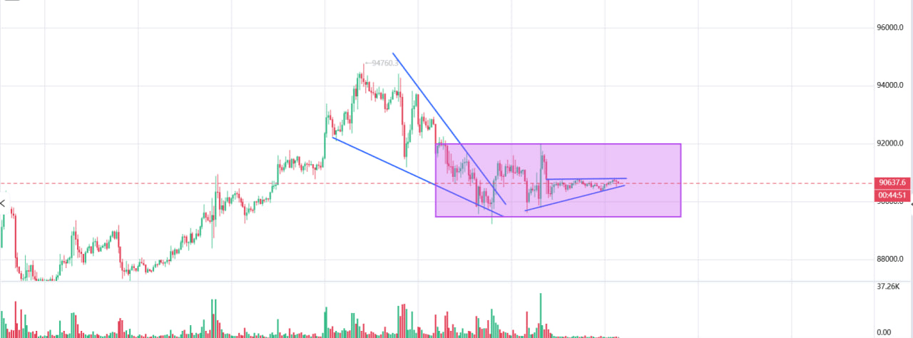 Rynek jest ściśnięty między płynnościami <90k a >92k.
