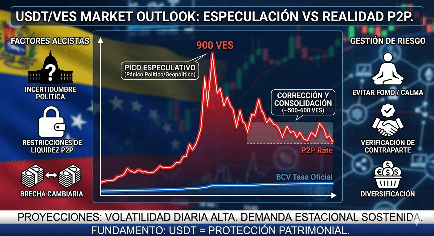 W ostatnich dniach rynek P2P USDT/VES przeżył jedną z najbardziej wahań w ostatnich miesiącach. Po wydarzeniach politycznych, które zapoczątkowały rok, cena cyfrowego dolara drastycznie odrywała się od oficjalnej stawki BCV, osiągając spekulacyjne szczyty powyżej 700-900 VES, zanim rozpoczął się proces korekty.