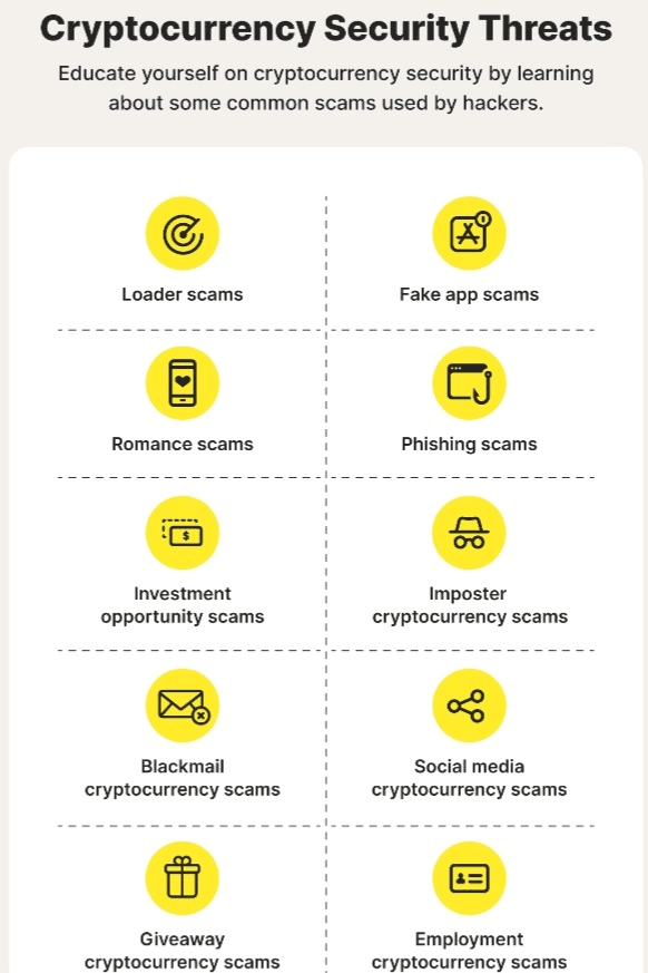 · Oszustwa inwestycyjne/phishingowe: Nieproszona oferta z gwarantowanymi wysokimi zyskami, fałszywi agenci wsparcia klienta proszący o Twoją frazę zabezpieczającą lub klonowane strony internetowe.