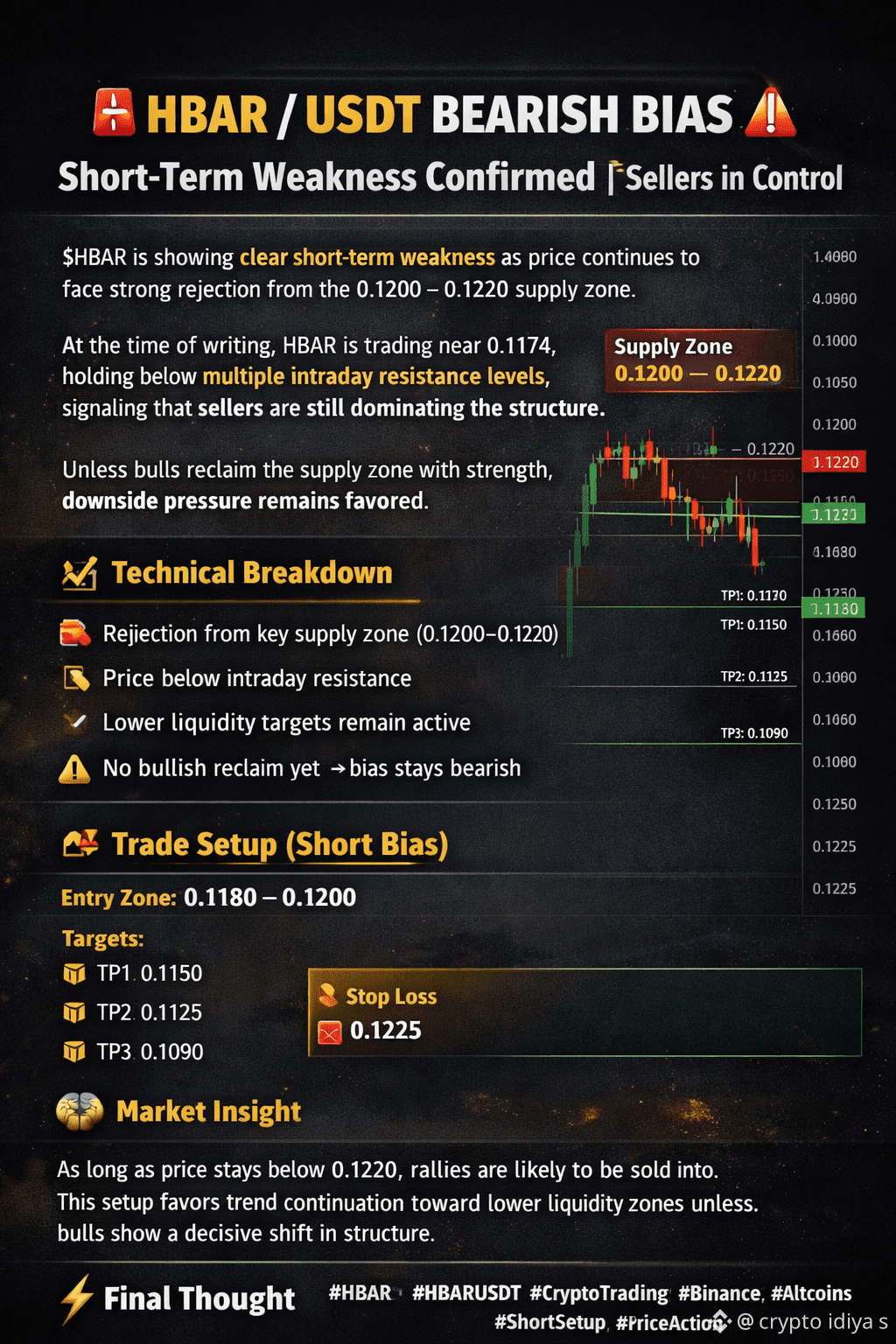 $HBAR is showing clear short-term weakness as price continues to face strong rejection from the 0.1200 – 0.1220 supply zone.
