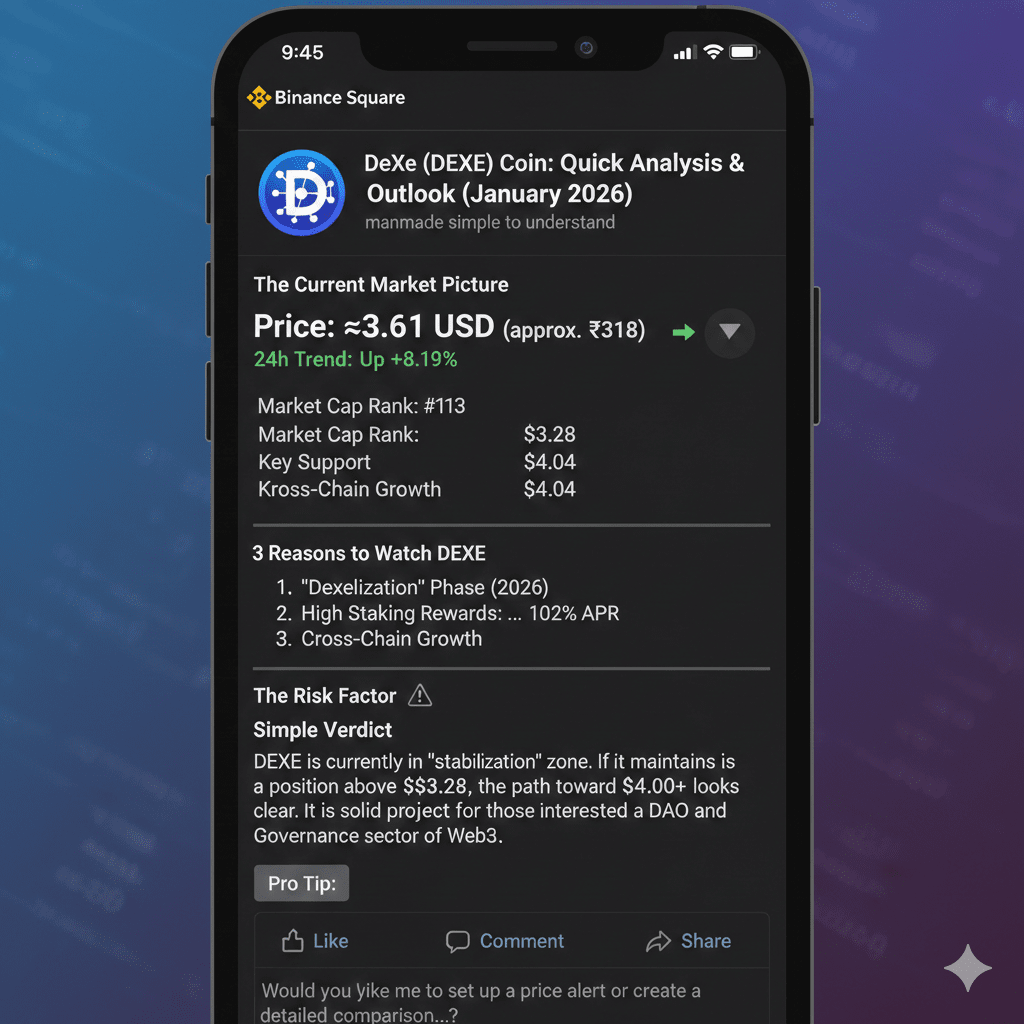 DEXE jest obecnie w strefie "stabilizacji". Jeśli utrzyma swoją pozycję powyżej $3.28, droga do $4.00+ wydaje się jasna. To solidny projekt dla tych, którzy są zainteresowani sektorem DAO i zarządzania w Web3.