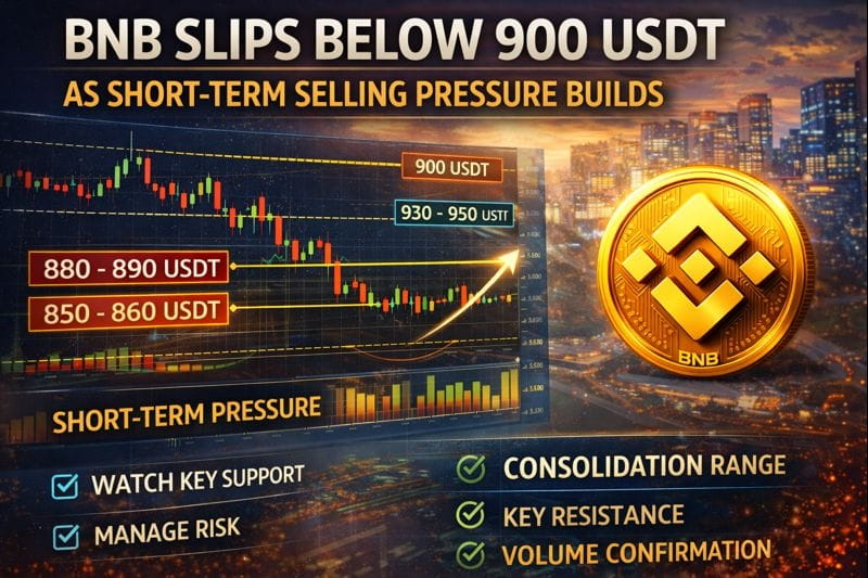 BNB handlował poniżej poziomu 900 USDT, zanotowując spadek o 0,72% w ciągu ostatnich 24 godzin. Ruch ten odbija krótkoterminowy nacisk sprzedaży, a nie decyzyjny obrót trendu, ponieważ ogólne warunki rynkowe nadal są mieszane, a traderzy ponownie oceniają swoje ryzyko.