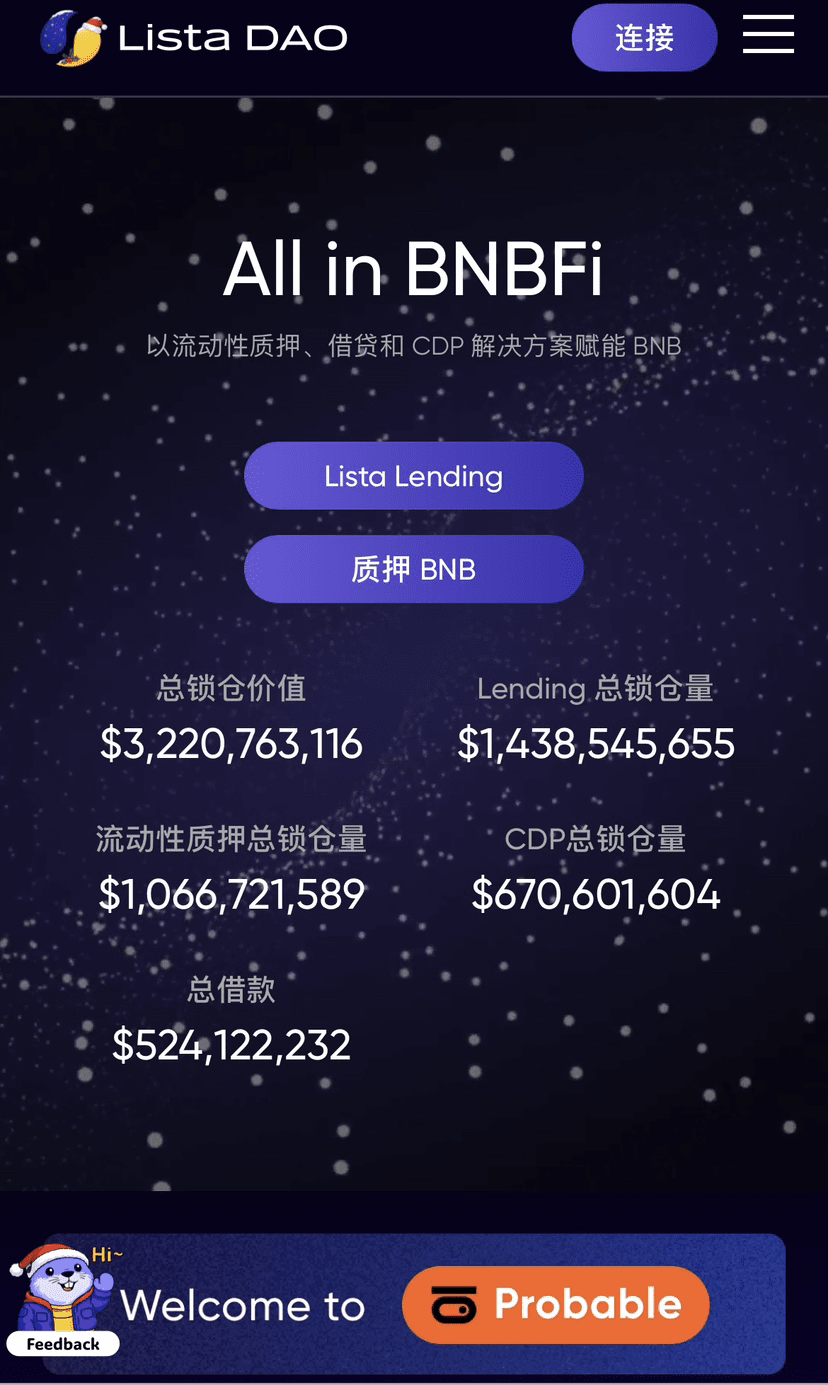 Przejdź na oficjalną stronę Lista DAO, połącz swój portfel. Wybierz posiadane niebieskie aktywa jako zabezpieczenie, takie jak BTCB, ETH lub BNB.