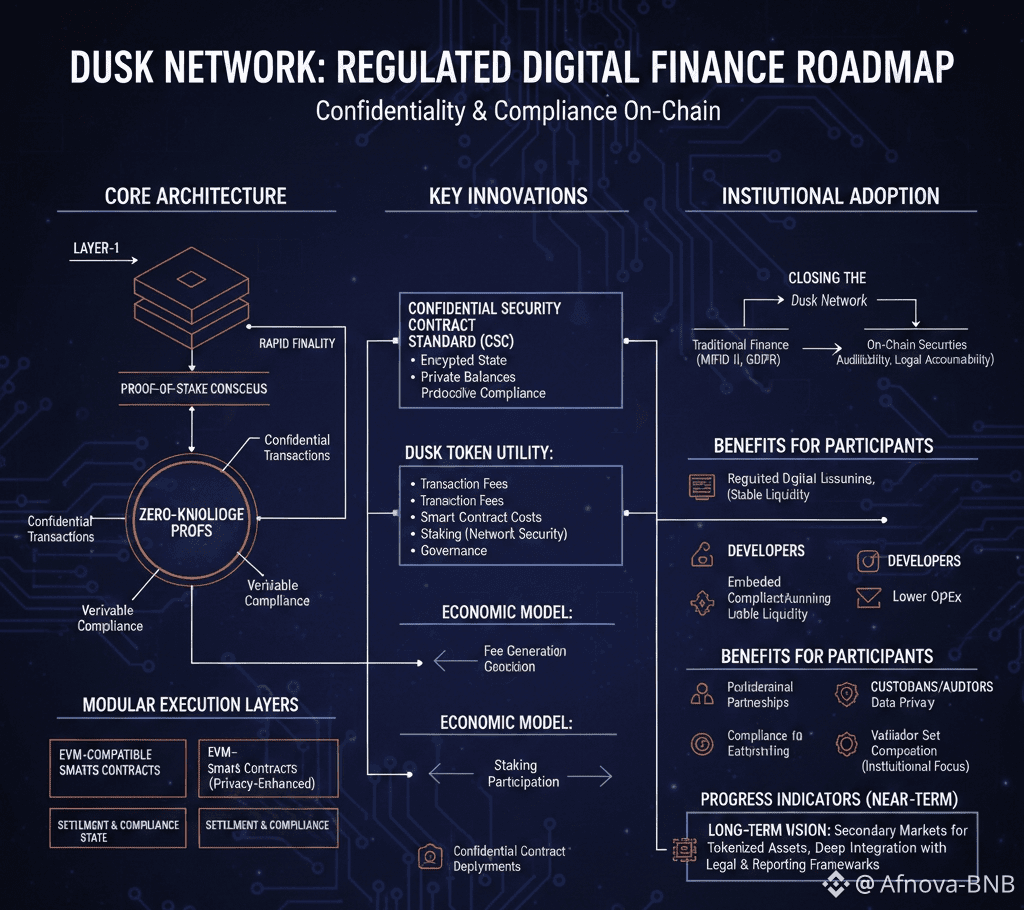 At its core, Dusk operates as a Layer-1 blockchain purpose-built for regulated financial activity. Its architecture is structured around several foundational components. Consensus is based on a proof-of-stake mechanism optimized for rapid finality and energy efficiency, with parameters tuned to support privacy-preserving execution rather than raw throughput alone. Zero-knowledge proof systems form the backbone of confidentiality across the network, allowing transaction validity, ownership, and compliance conditions to be proven without exposing sensitive data. Execution is modularized across distinct layers, with one component providing EVM-compatible smart contract execution enriched with privacy features, and another managing settlement, data availability, and compliance-related state transitions. This separation allows confidential execution without compromising the integrity or auditability of the underlying ledger.