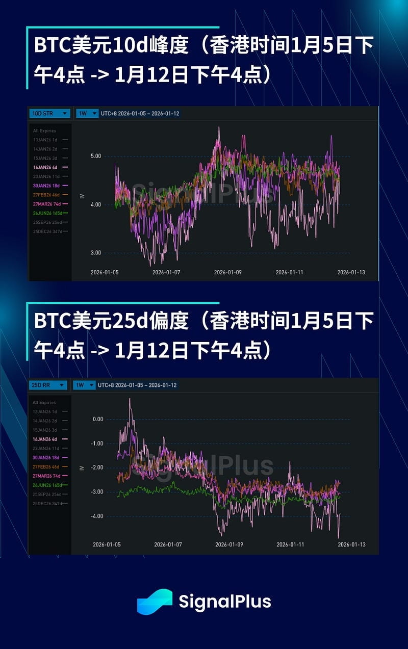 Struktura czasowa zmienności implikowanej zaczęła się wydłużać, z krótkoterminową zmiennością dzienną ustaloną na poziomie około 35%, zgodnie z niedawnym zachowaniem rzeczywistej zmienności. To nieuniknienie wpływa na wszystkie daty wygaśnięcia do końca stycznia, podczas gdy dzienna zmienność do końca stycznia nadal utrzymuje się na wysokim poziomie około 48%, co prowadzi do efektu wydłużenia. Jeśli cena będzie utrzymywać się w zakresie 88 000–94 000 USD, zmienność na froncie rynku może szybko spadać, dlatego możemy dalej obserwować presję na froncie, podczas gdy na dalszych odcinkach krzywej, po wyższych poziomach zmienności w ostatnim kwartale ubiegłego roku, rynek jest bardziej ostrożny w strukturalnym sprzedaży zmienności na obecnym poziomie.