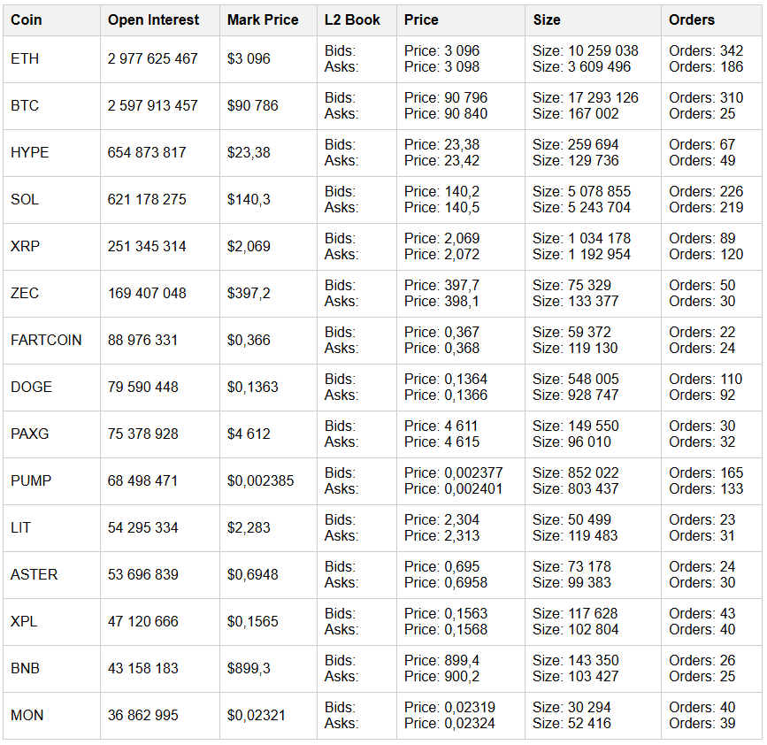 Analiza 15 najlepszych perpetuali według otwartego zainteresowania z książką L2 na giełdzie #HyperLiquid (#defi) na dzień 17:00, 12 stycznia 2025.