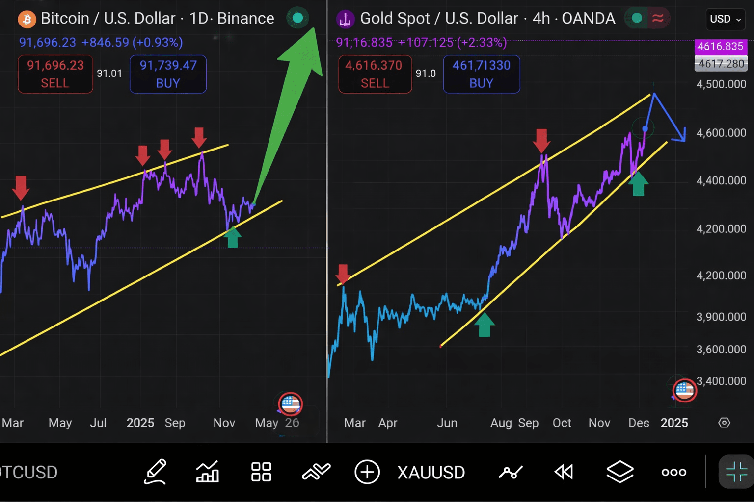 Oba #BTCUSDT. D (Daily) i #XAUUSD USD (4H) notują się w dobrze zdefiniowanych kanałach rosnących, co jest silnym wskazaniem na to, że struktura rynku na wzrost pozostaje niezmieniona mimo krótkoterminowej wrażliwości wahań.