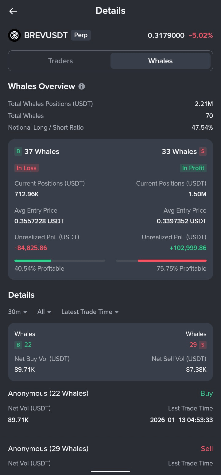 • 33 krótkich wielorybów • Średnie wejście krótkich: ~0,3397 • Niezrealizowany zysk/strata: +103 tys. USD • Około 76% krótkich wielorybów jest zyskownych