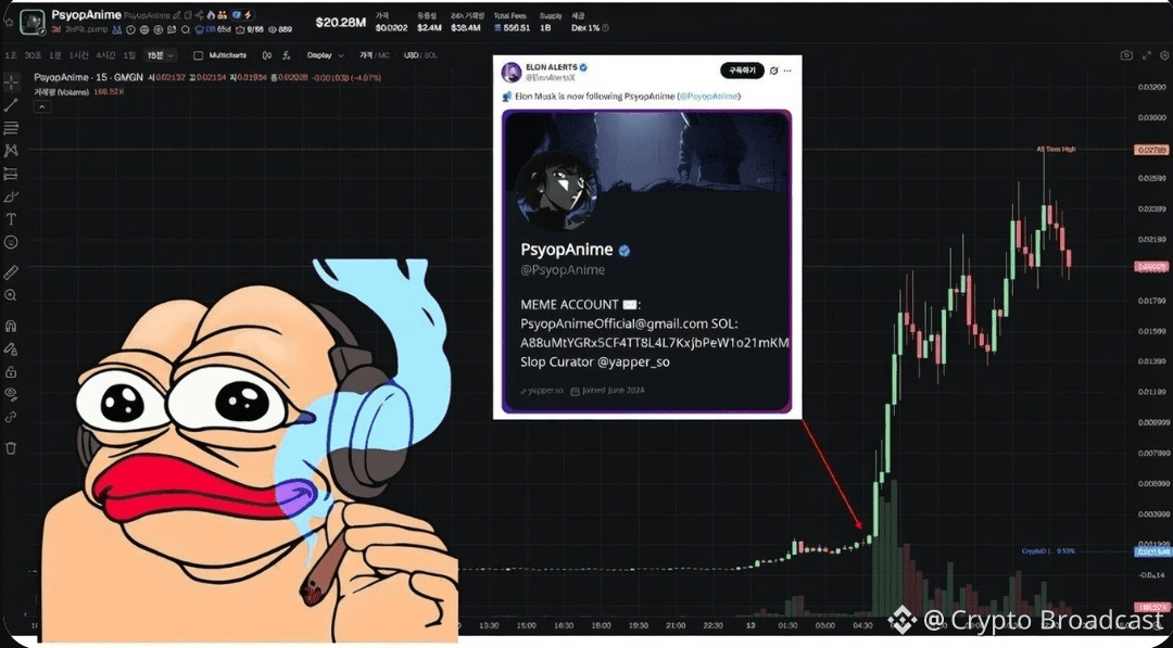 - [Degen] Elon followed $PSYOPANIME and surged 4700% to $20m