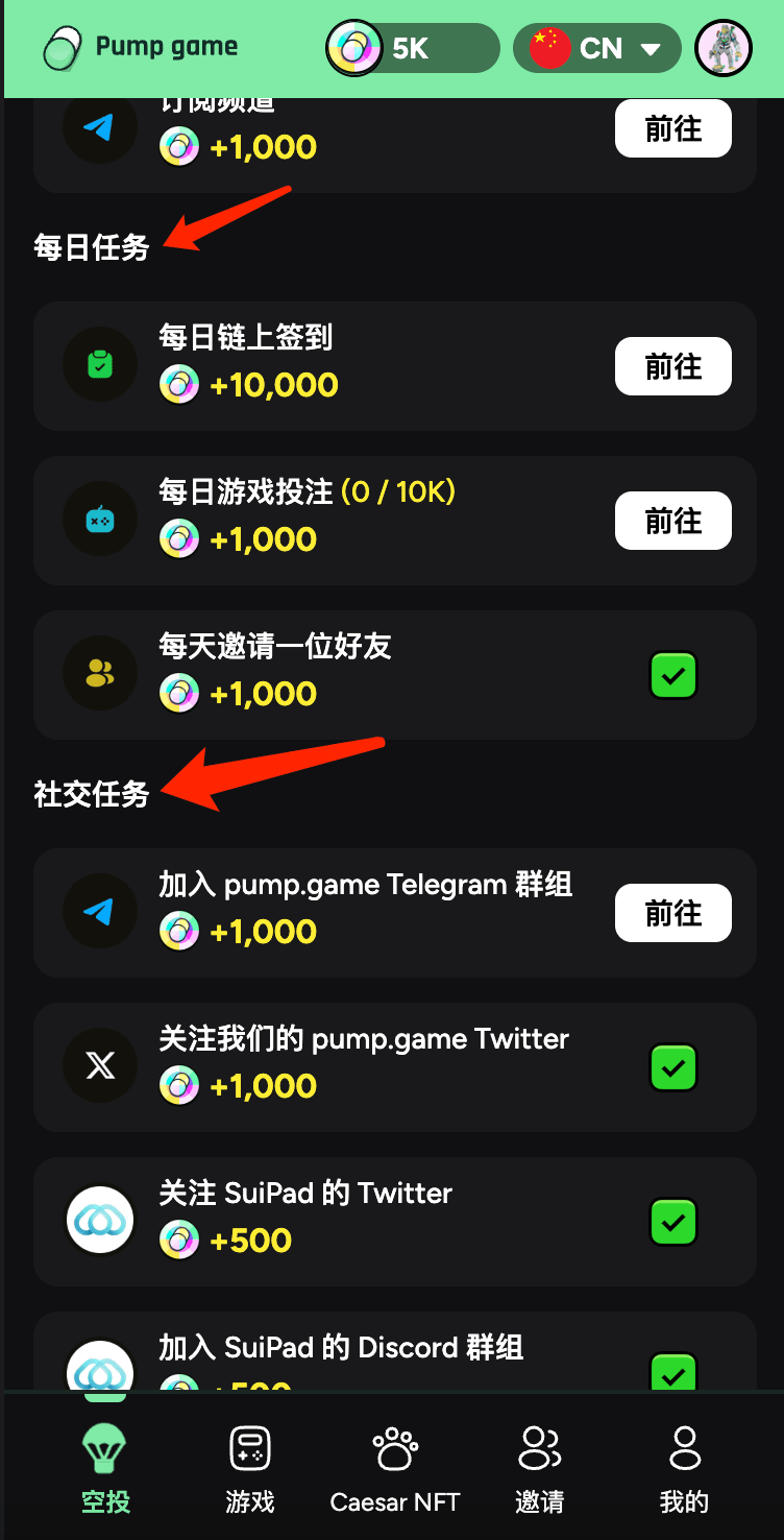Jeśli ukończysz określone zadania, możesz zdobyć punkty $GAMES, które będą używane do późniejszego przydziału airdropów dla osób prywatnych i drużyn.