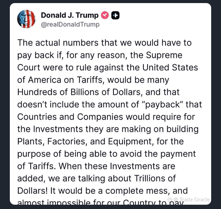 Trump mówi, że odwrócenie cła może narażać USA na setki miliardów — nawet triliony — dolarów zobowiązań. Taki szok nie tylko uderzy w rynki; może osłabić długofalową pozycję gospodarczą i globalną Stanów Zjednoczonych.