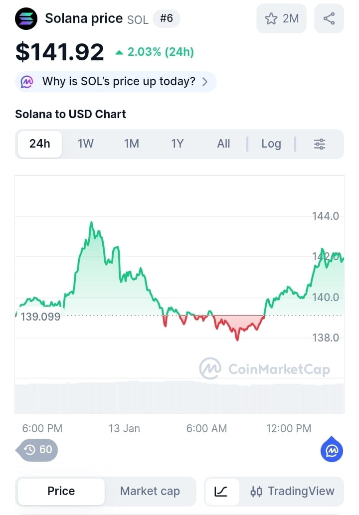 SOL jest notowany wokół ~140–145 USD, po odstąpieniu od poprzednich szczytów (znacznie poniżej rekordowych najwyższych poziomów z stycznia 2025 roku).