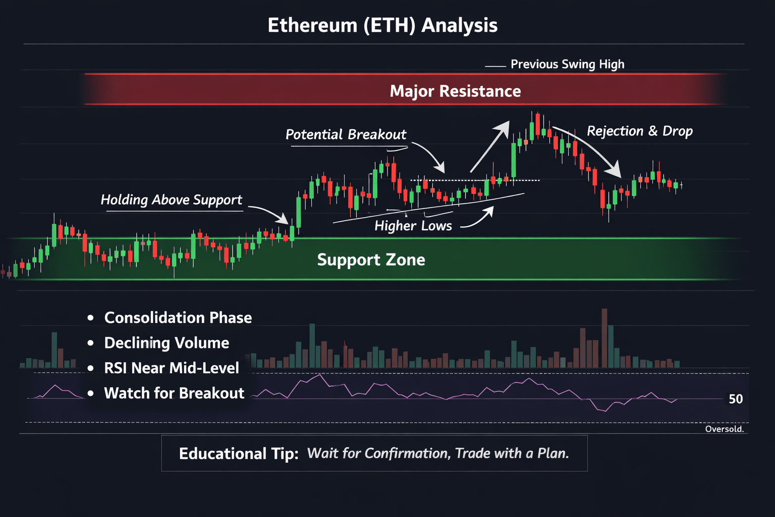 Dopóki Ethereum utrzymuje się powyżej kluczowego wsparcia, a struktura wyższych minimów jest nienaruszona, tendencja pozostaje bycza w średnim okresie. Potwierdzone wybicie powyżej oporu przy silnym wolumenie może sygnalizować początek nowego wzrostuEducational Takeaway: