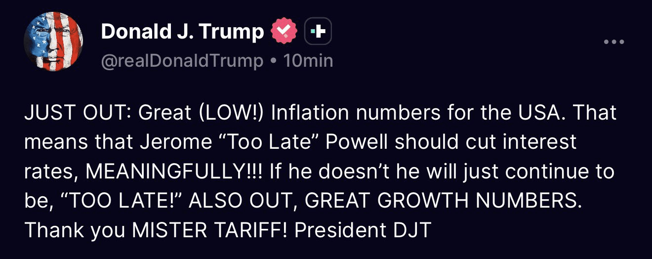 Nowa wiadomość! 🇺🇸 Prezydent Trump właśnie opublikował wiadomość, w której mówi, że Jerome Powell, szef Federalnego Banku Rezerwy, powinien obniżyć stopy procentowe i zrobić to szybko! 😮