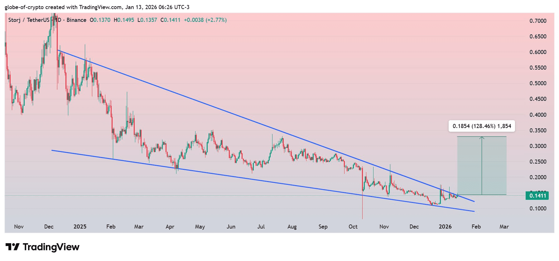 $STORJ aktualnie testuje kluczowy poziom oporu na tygodniowym wykresie, handlowany wewnątrz dobrze zdefiniowanego wzoru spadkowego wklęśnięcia — struktury, która często poprzedza silne wzrostowe odwrócenia.