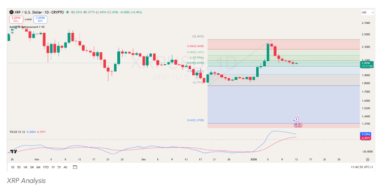 Jeśli XRP nie odzyska strefy 2,09–2,17 USD, nacisk na spadek może się ponownie pojawić, z pierwszym wsparciem na poziomie 0,618, a następnie głębszym wsparciem na poziomie korekcyjnym 0,786 w okolicach 1,91 USD. Przecięcie tego poziomu odsłoniłoby obszar niższego popytu w okolicach 1,77 USD, który stanowi podstawę szerokiego strukturalnego układu Fibonacciego.
