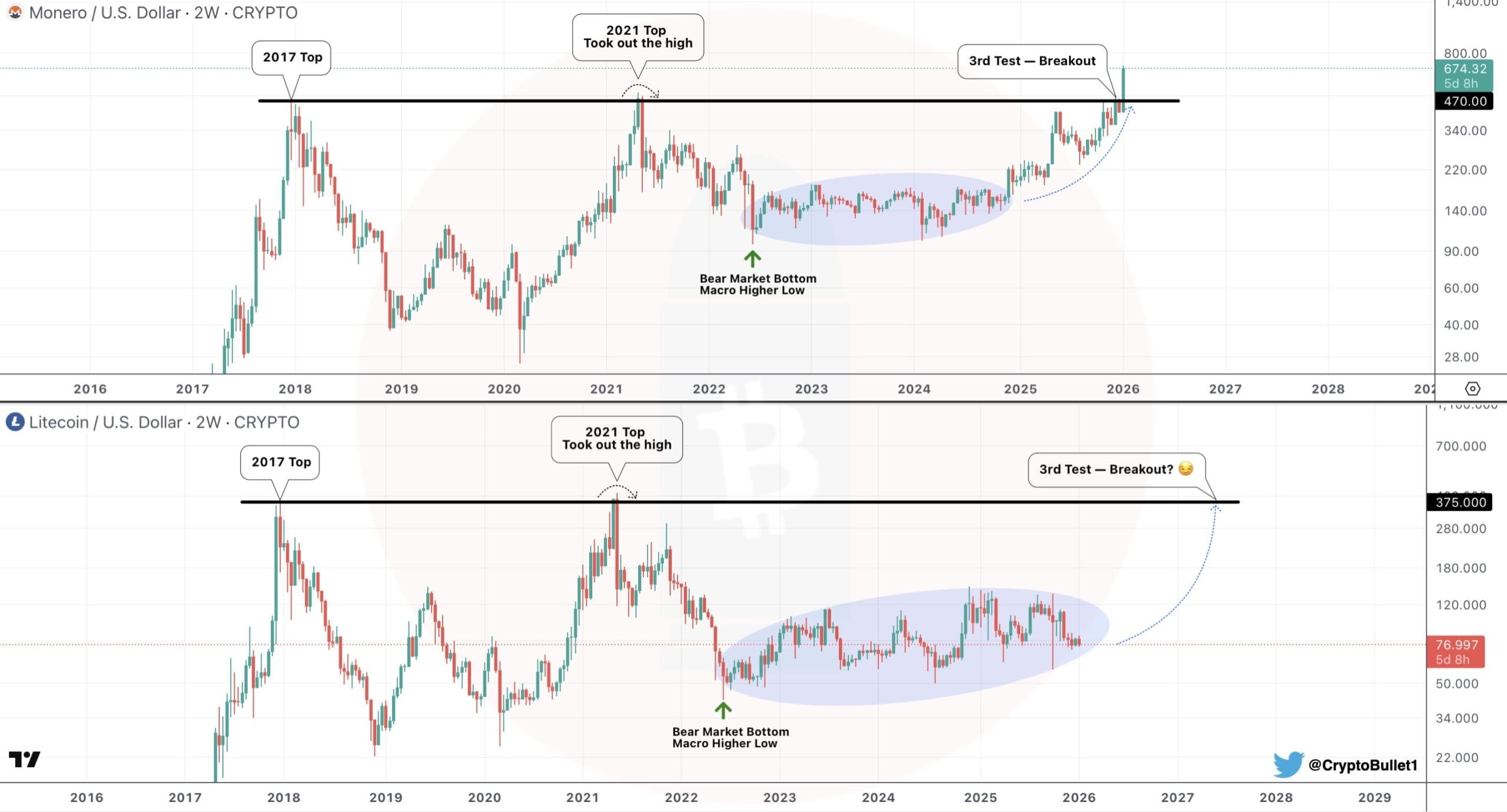 Zgodnie z tygodniowym wykresem udostępnionym przez analityka kryptowalut CryptoBullet, struktura Litecoin ściśle odzwierciedla historyczne zachowanie cen Monero w różnych cyklach rynkowych.