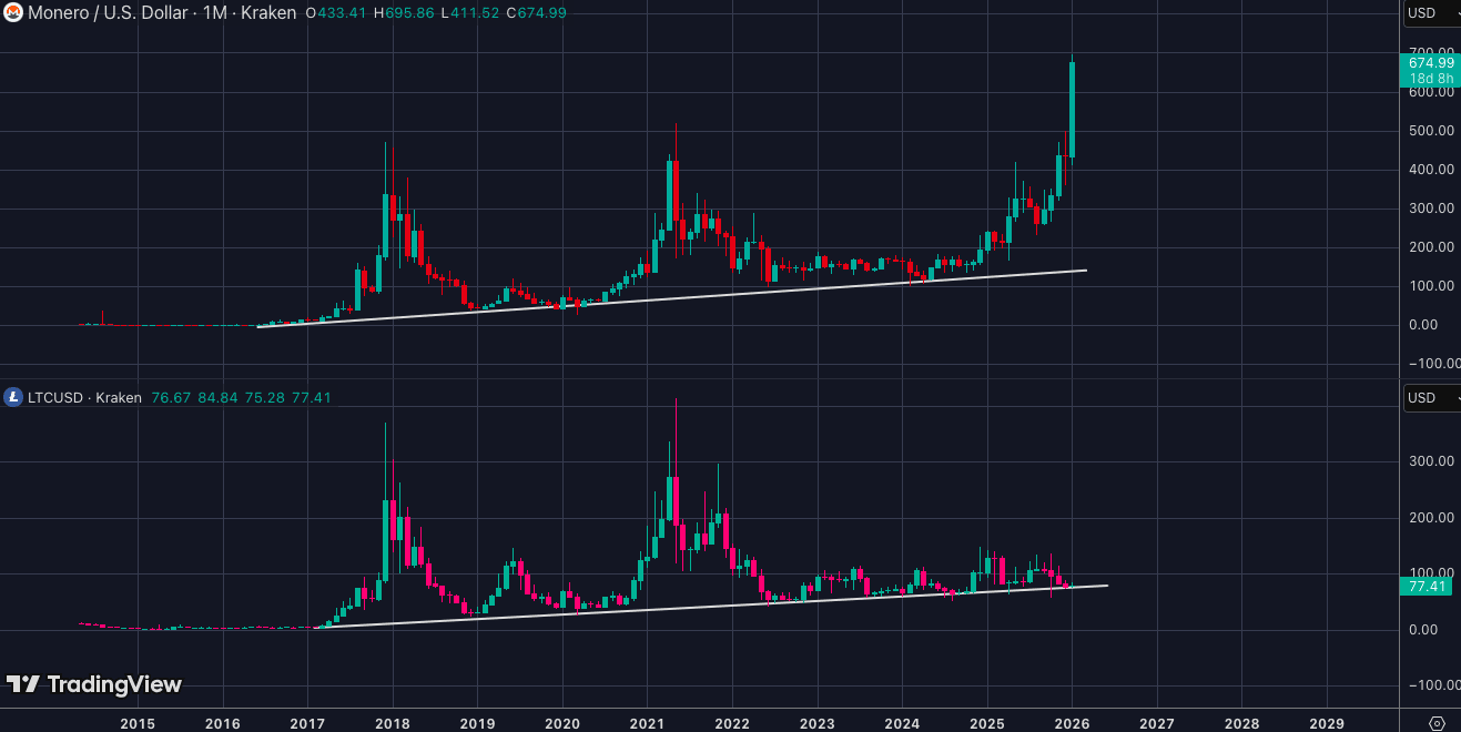 Porównanie sugeruje, że Litecoin może cicho przygotowywać się do większego ruchu, podobnie jak Monero już zaczął realizować.