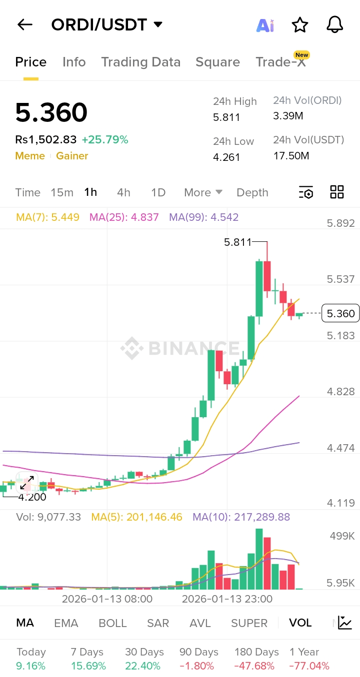 * Działanie cenowe i tendencja: Po długim okresie konsolidacji wokół poziomu 4,20 USD, cena doznała olbrzymiego pionowego wzrostu, osiągając szczyt na poziomie 5,811 USD. Jest to wzrost o 25,84% w ciągu ostatnich 24 godzin. Cena obecnie przebywa w małym korekcie, handluje na poziomie 5,362 USD.