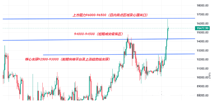 Nie ma potrzeby żałować, że nie udało się kupić na poziomie 91734 USD, ani nie należy zbytnio wahać się z wejściem w okolice 95400 USD. Na rynku zawsze są możliwości, kluczowe jest ograniczenie chciwości po szybkim wzroście oraz pokonanie paniki w okresie wahań. Należy szczególnie zwrócić uwagę na efekty wsparcia w okolicy 95000 USD oraz zaufanie do pozycji w pobliżu 3300 USD, co jest ważniejsze niż krótkoterminowe wahania cen; cierpliwie czekać na sygnały stabilizacji po korekcie, jest często bardziej rozsądne niż ślepe podążanie za wzrostem.