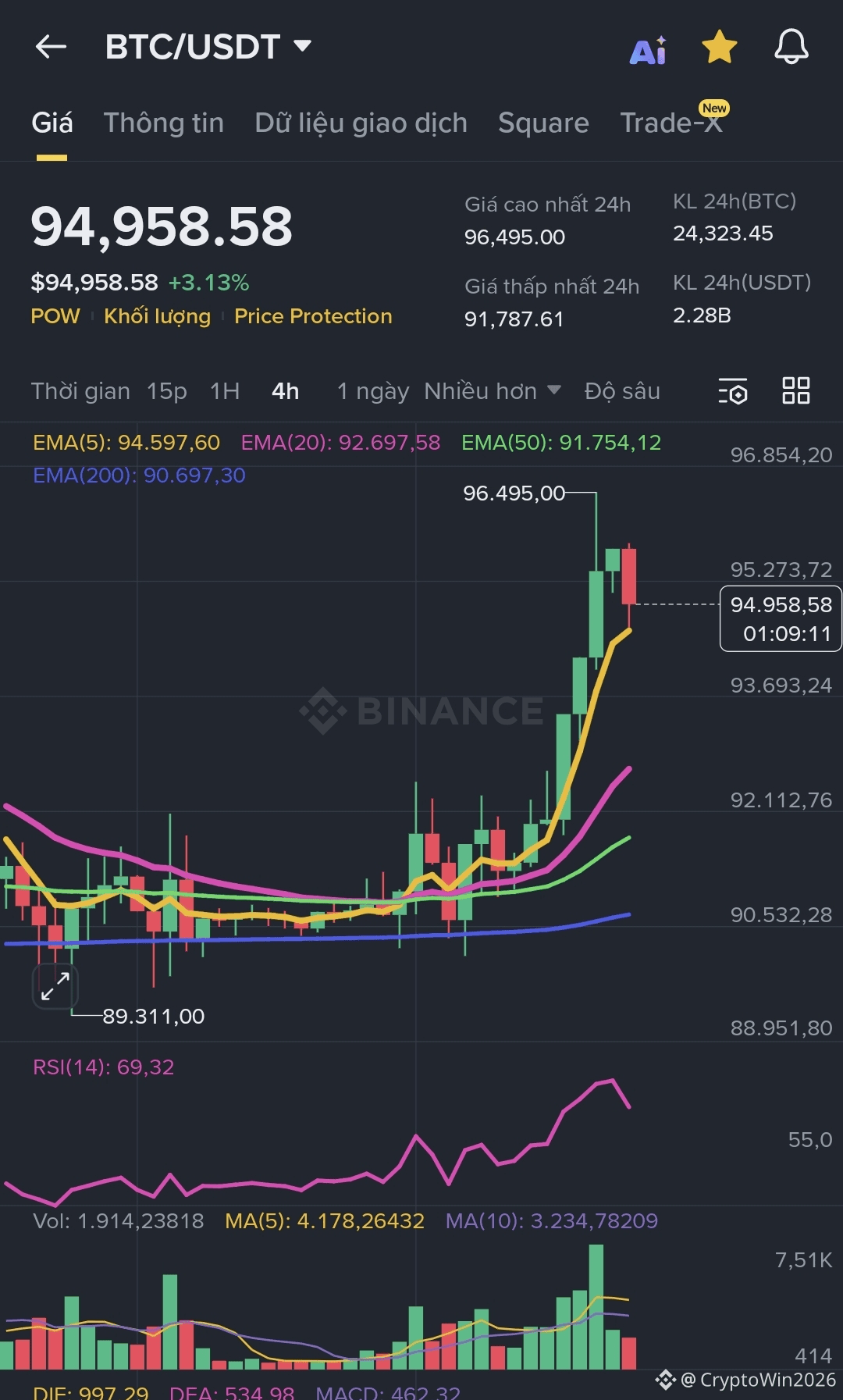✅️ Short squeeze mạnh mẽ: BTC break kháng cự quan trọng $94,500 (sau 3 lần thất bại trước), gây cascade liquidations hơn $500-590M shorts. Bears bị "rekt", buộc cover position đẩy giá lên nhanh.
