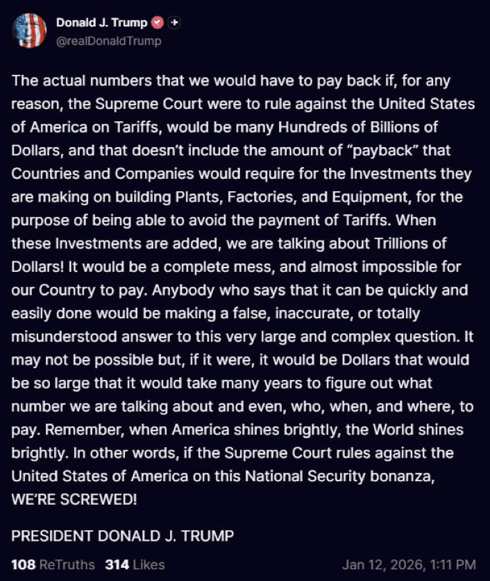 Więc jeśli zapadnie orzeczenie przeciwko taryfom, rynek akcji może doświadczyć spadku, a to również zepchnie rynek kryptowalut.