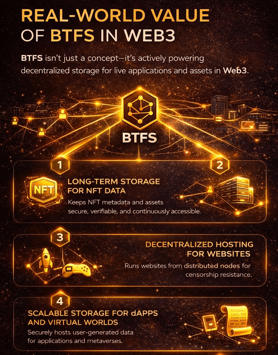 Za wieloma działającymi aplikacjami i aktywami cyfrowymi BTFS działa cicho, zapewniając rzeczywiste przechowywanie dla rzeczywistych użytkowników, bez centralnych punktów kontroli.