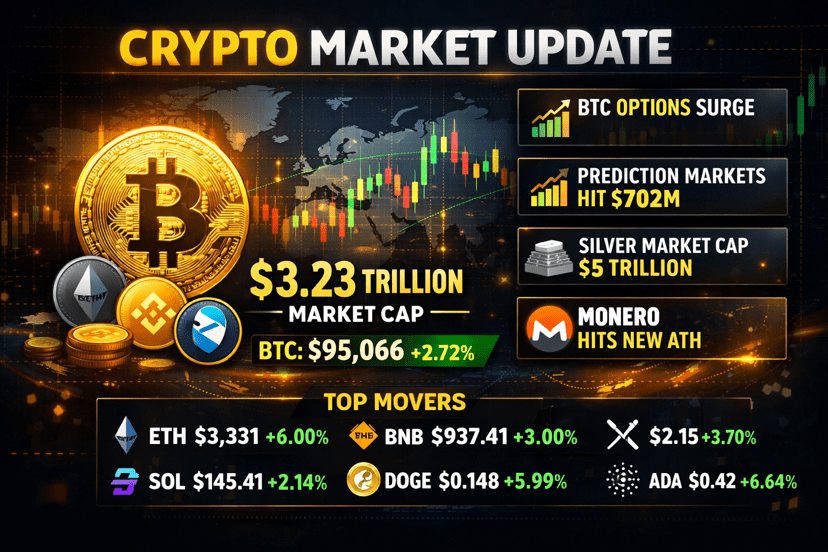 Według CoinMarketCap kapitalizacja rynku globalnych kryptowalut wzrosła do 3,23 biliona USD, co oznacza wzrost o 3,08% w ciągu ostatnich 24 godzin.$BTC