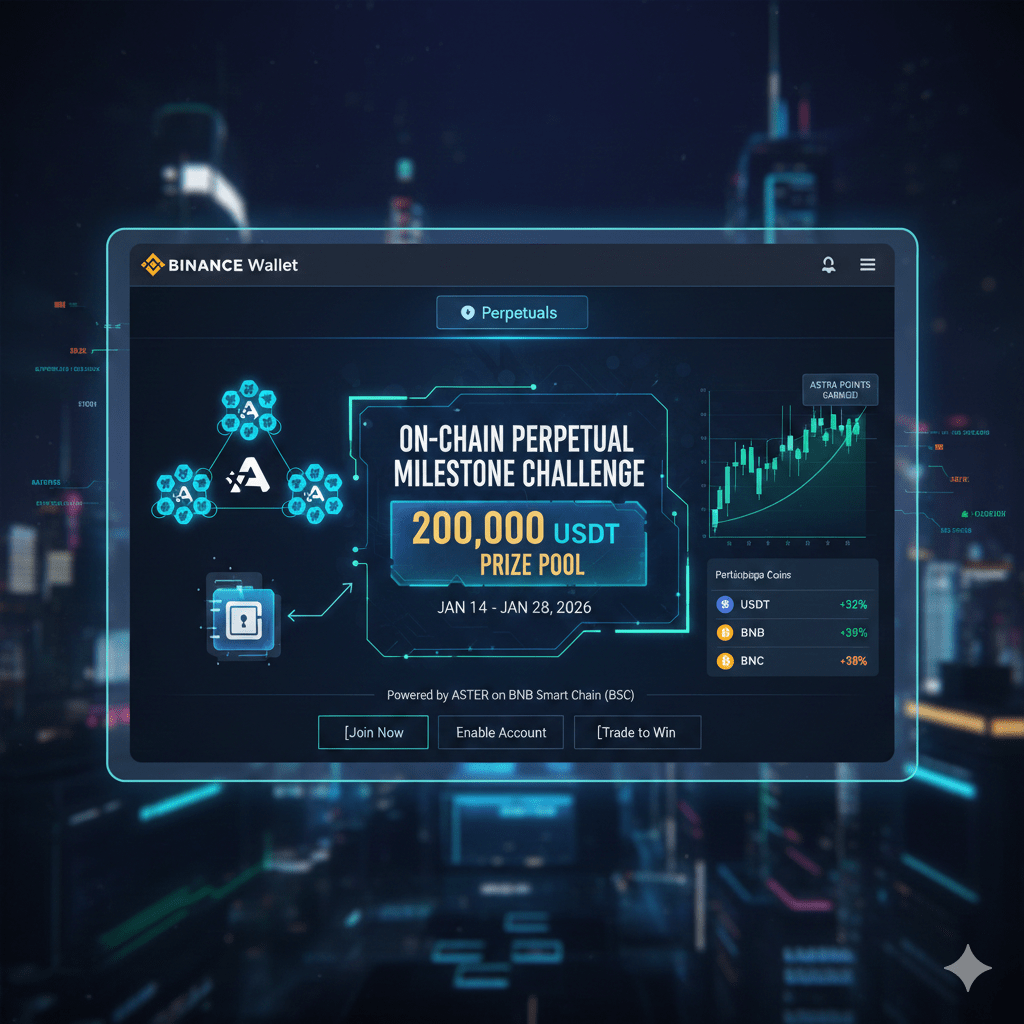 Obchodzi się integrację platformy rozproszonych kontraktów terminowych Aster, lidera w tej dziedzinie, z portfelem Binance Web3 Wallet, Binance uruchomił wyzwanie „On-Chain Perpetual Milestone Challenge”.