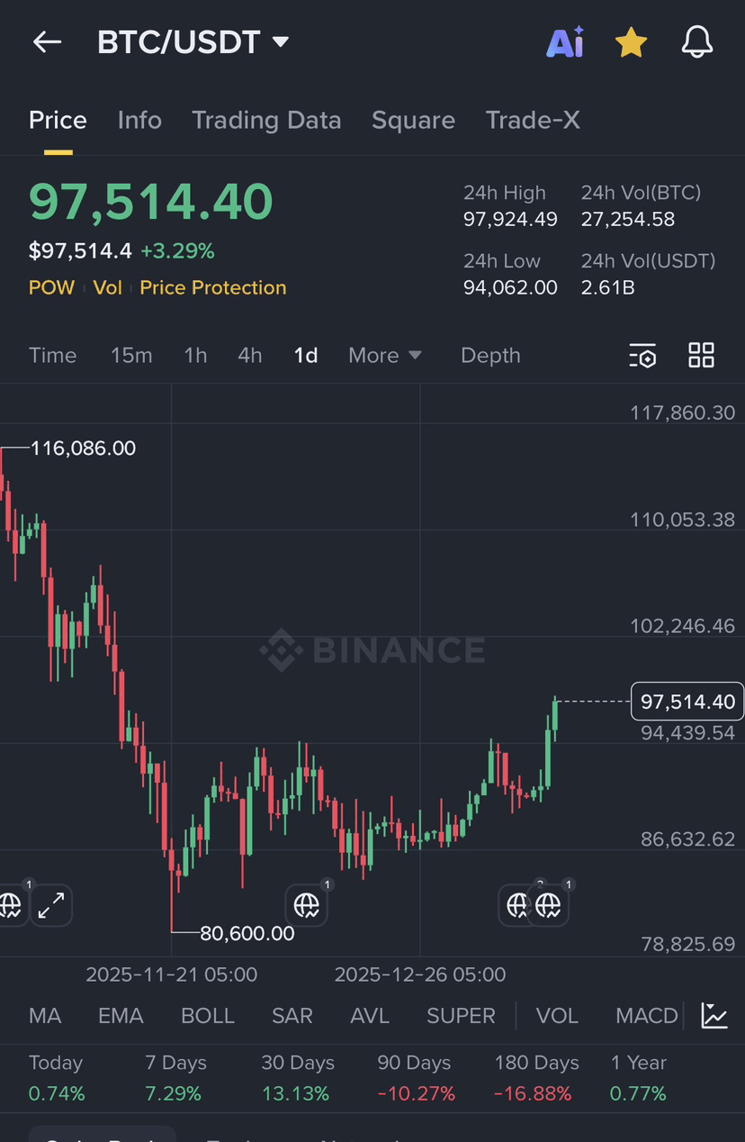$BTC obecnie notuje w okolicach ~97 500 USD, utrzymując siłę po silnym przeskoku powyżej strefy przełamania 95 000 USD.