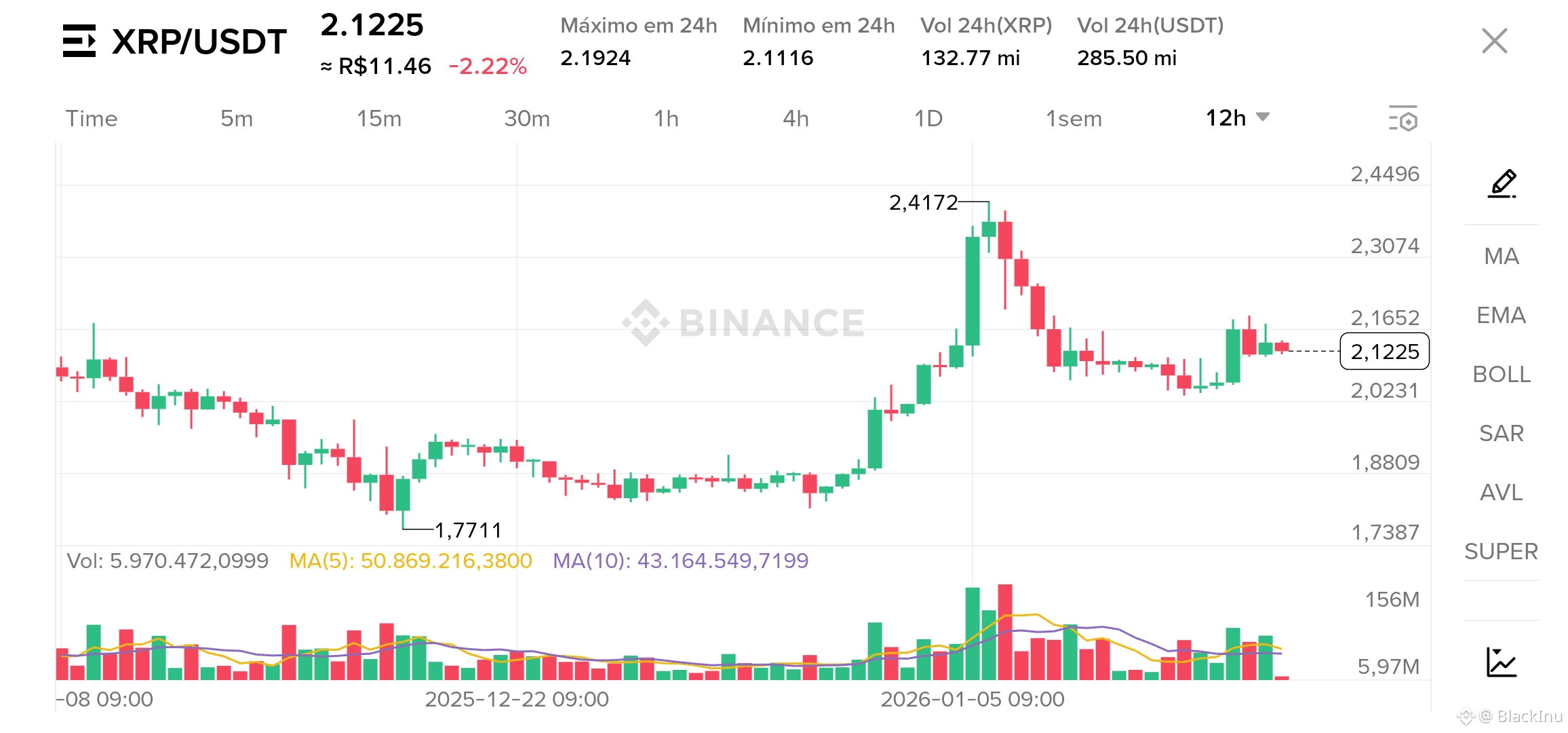 XRP/USDT negociando em 2.1225 (-2.22% no dia), com suporte imediato em 2.1116 e resistência em 2.1924.