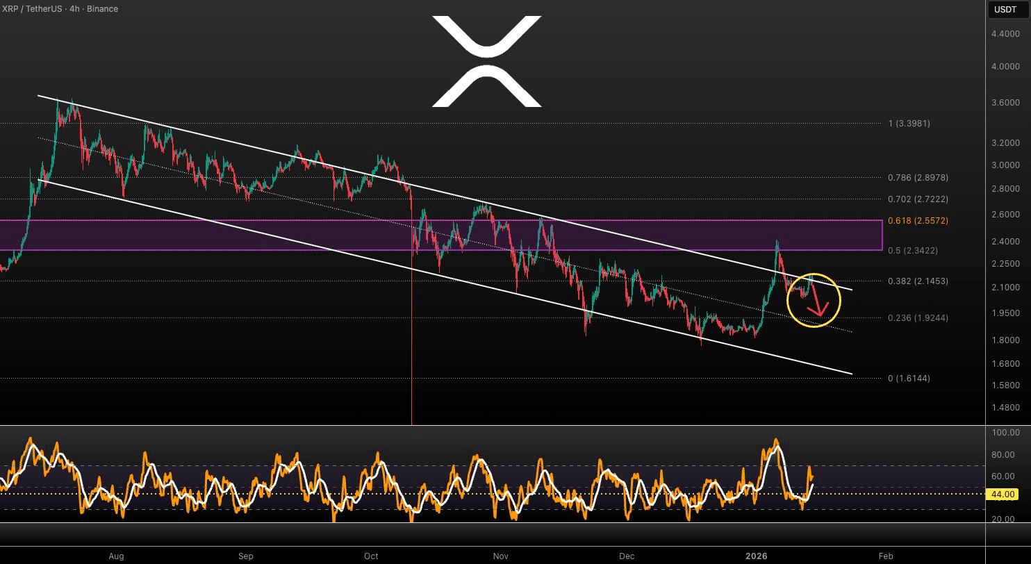 Jeśli XRP nie zdoła przełamać oporu spadającego kanału, cena prawdopodobnie będzie kontynuować spadek w kierunku regionu 1,92 USDT. Ten poziom reprezentuje zbieżność wsparcia Fibonacciego i struktury kanału, co czyni go naturalnym magnesem dla ceny w krótkim okresie.